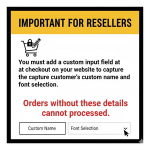 Important for Resellers: You must add a custom input field at checkout on your website to capture the customer’s custom name and font selection. Orders without these details cannot be processed